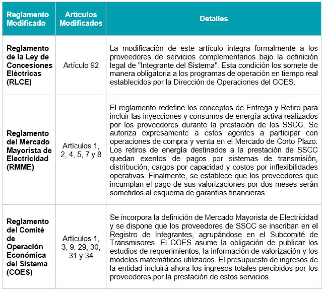 Las principales reformas a estos cuerpos normativos, orientadas a integrar a los proveedores de Servicios Complementarios al mercado eléctrico, son las siguientes: