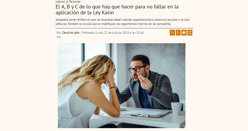 Su punto es complementado por la socia de Philippi Prietocarrizosa Ferrero DU & Uría (PPU), Paulina Miranda, quien indica que la Ley Karin implica todo un desafío de las empresas, ya que significa “hacer efectiva la ´lucha’ contra el acoso y violencia por medio de capacitaciones tanto informativas de la nueva ley, de los riesgos identificados, como de concientización de la importancia del buen trato, no discriminación y perspectiva de género”.