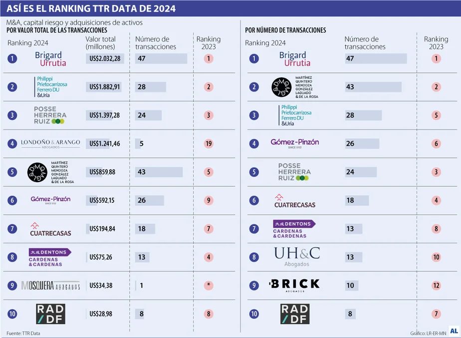 Brigard Urrutia fue la firma líder en ambos listados. En 2024 tuvo un total de 47 transacciones, por un valor de US$2.032,28 millones. En monto de las operaciones, el segundo lugar lo tuvo Philippi Prietocarrizosa Ferrero DU & Uría Colombia, PPU, con US$1.882,91 millones; mientras que el podio lo completó Posse Herrera Ruiz, con US$1.397,28 millones.