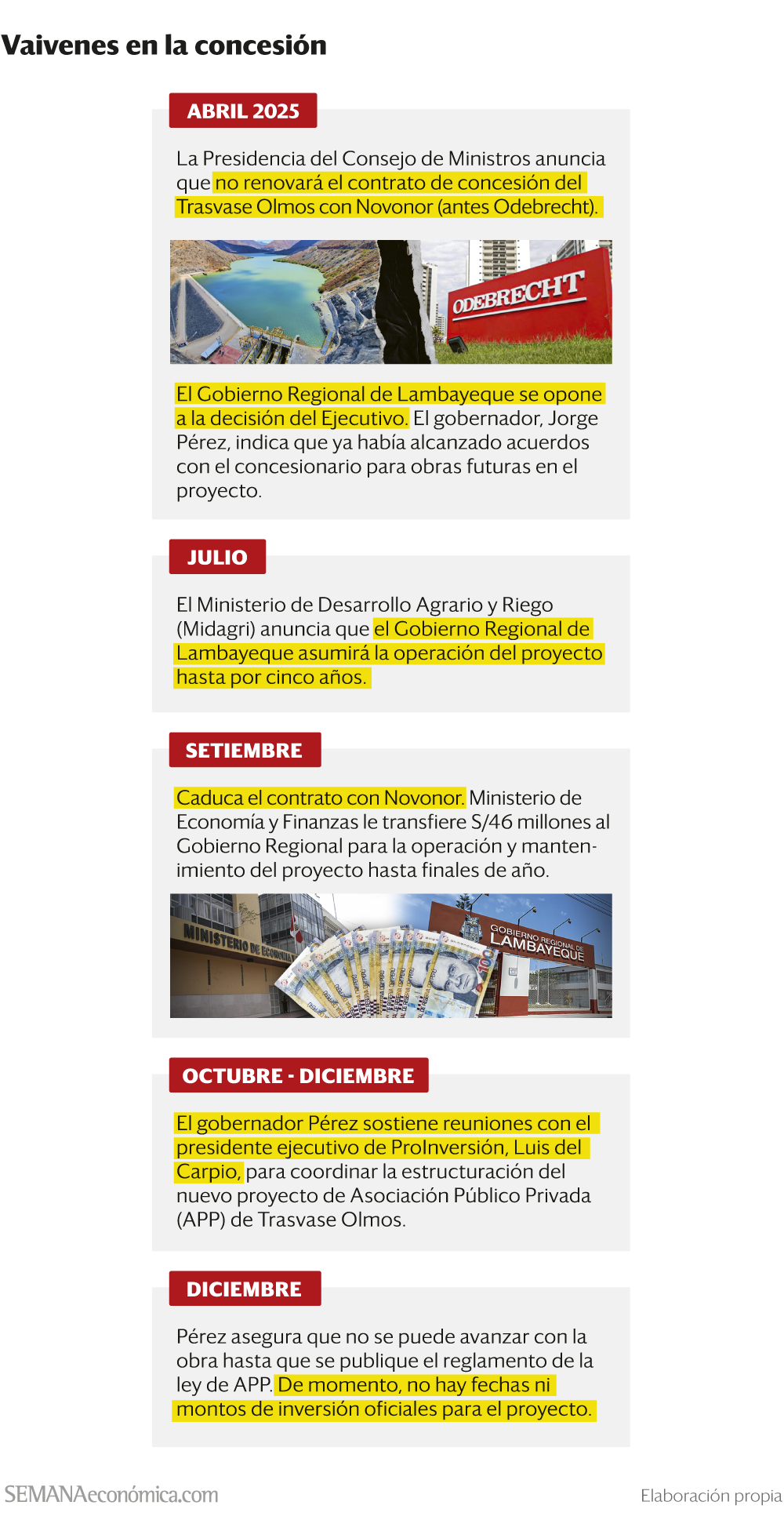 En abril, el entonces presidente del Consejo de Ministros, Gustavo Adrianzén, anunció que el Ejecutivo no renovaría el contrato de Novonor como concesionario del proyecto. Fue una decisión política del gobierno de la expresidenta Dina Boluarte, que no deseaba ser percibida como flexible frente a la otrora Odebrecht. El gobernador regional de Lambayeque, Jorge Pérez, se opuso, pues el GORE ya venía negociando una adenda al contrato con Novonor. Desde entonces, se trazó como único camino la estructuración de una APP que integre la operación y mantenimiento del proyecto, además de una serie de construcciones para ampliar la capacidad de la presa Limón; infraestructura que traslada las aguas del río Huancabamba hacia las hectáreas de riego.